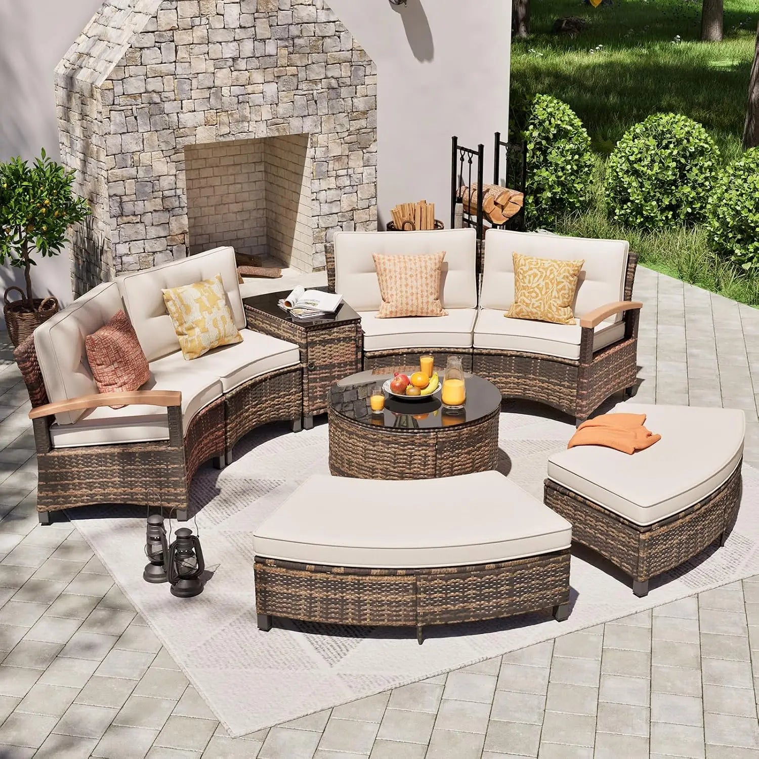 Multi-piece Outdoor Patio Furniture Sets, Half Moon Curving Part of The Sofa Rattan Patio Conversation Sets