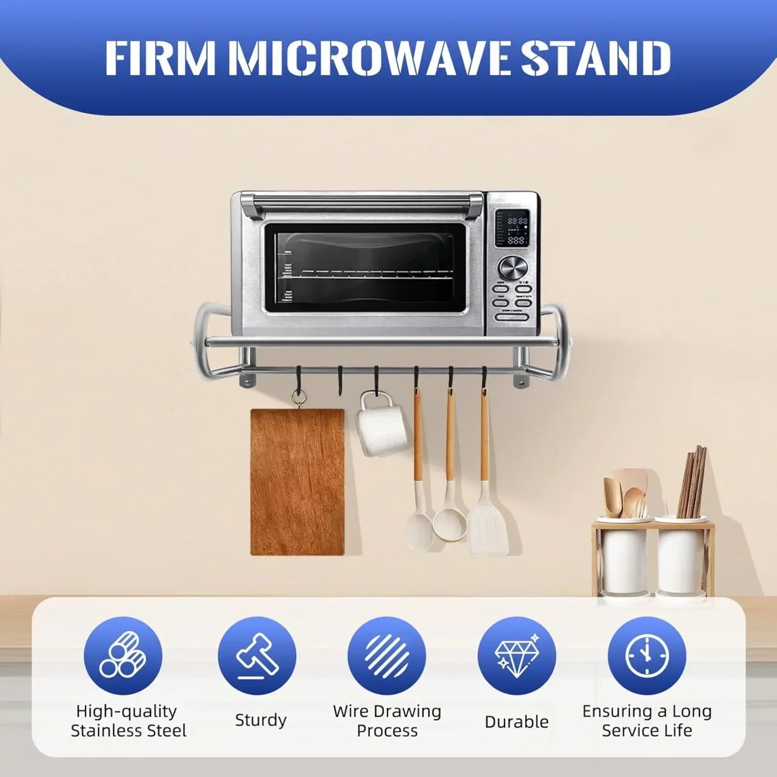 Maximize your counter space with a sleek, stainless steel microwave utensil shelf that keeps everything within reach.